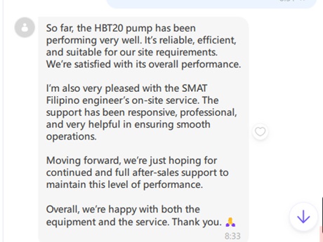 "So far, the HBT20 pump has beenperforming very well. It's reliable, efficient,and suitable for our site requirements.We're satisfied with its overall performance.