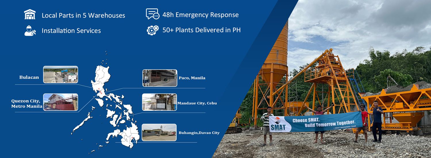 SMAT Machinery has been a trusted local partner for concrete batching plants in the Philippines, providing all type solutions nationwide. With five warehouses in Manila, Quezon City, Cebu, Davao, and Bulacan, our response network covers the entire country. We provide comprehensive support from selection and installation to commissioning and maintenance—we don't just sell equipment, we grow with you and support your construction business.
